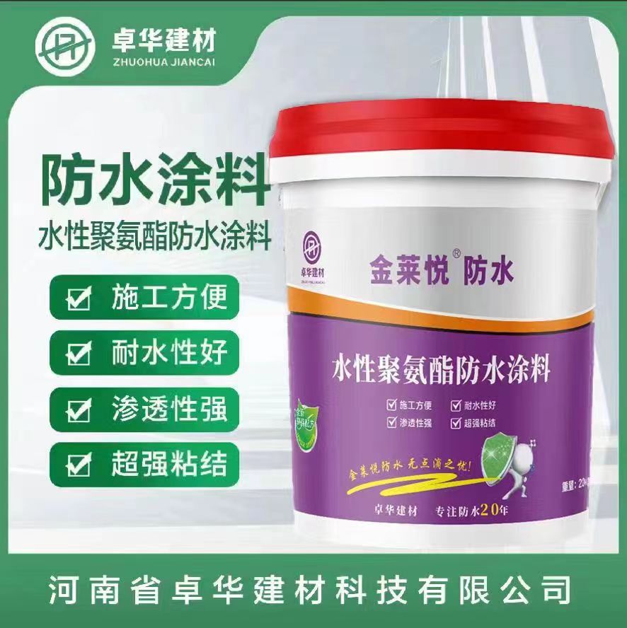 产品简介:金莱悦水性聚氨酯防水涂料,是采用德国原装进口聚合物乳液为基料,经过特殊工艺,再加上多种活性阻水因子,和进口颜料色浆,调配而成的单组份水乳型防水涂料。色彩可调配,常用的颜色有黑色,蓝色,红色等,颜色可定制。
